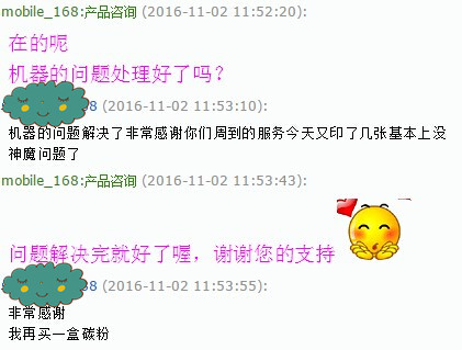 第二天,客戶又找到我們客服,客服問客戶機器有沒有處理好了。客戶說機器的問題處理好了,還夸我們的服務非常周到,還跟我們客服說,今天又印了幾張,基本上沒什么問題了呢,表示非常感謝,然后,要在我們這邊買多一盒碳粉。