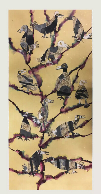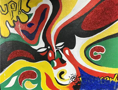 《話臉譜》是由我國傳統(tǒng)戲劇臉譜為基礎(chǔ),經(jīng)過線條、色塊的變形,表現(xiàn)出更為夸張的臉部表情。整體色彩鮮明,對(duì)比強(qiáng)烈,亮晶晶的粉末裝飾成為點(diǎn)睛之筆,使傳統(tǒng)的京劇臉譜變得更加鮮活、閃亮。