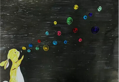 彩色的泡泡都是我用衍紙紙條一個(gè)一個(gè)卷成的,再把它們一個(gè)一個(gè)粘到紙上。我最喜歡吹泡泡了,彩色的泡泡帶著我的夢(mèng)飄呀、飄呀,飄向遠(yuǎn)方……