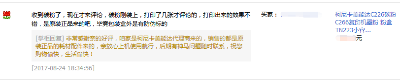 前段時間,鐘先生找我們家客服表示機器提示要更換碳粉了,讓我們家客服那天安排給他發過去。鐘先生下單后,客服就安排當天把碳粉給鐘先生發過去了。鐘先生收到碳粉后,寫了上圖所示的評價。