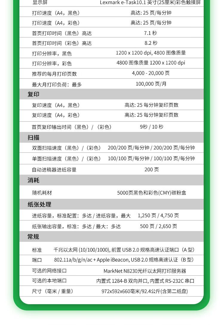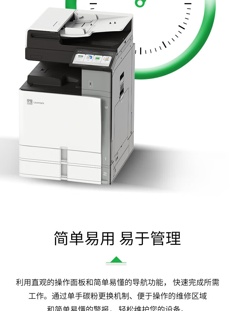 全新 利盟 (Lexmark ) CX950se彩色多功能一體機融合尖端科技,以安全可靠的多功能性、優異卓越的可持續性和超乎想象的易用性,為您開啟 A3 多功能打印的新篇章。逼真的打印效果,最高 25 頁/分鐘* 的打印速度,助您多快好省完成工作。25 厘米彩色觸摸屏直觀易操作,單通道雙面掃描輕松省時間。