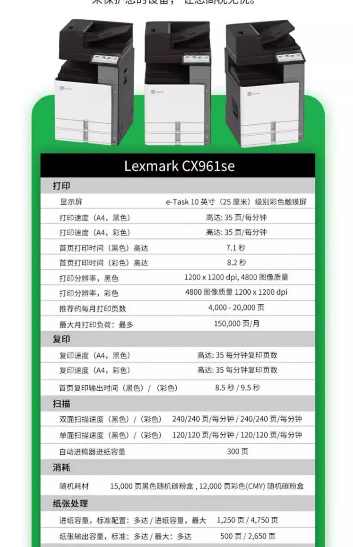 利盟(Lexmark)CX961se復(fù)印機(jī) 彩色激光多功能數(shù)碼復(fù)合機(jī)打印機(jī) 35頁/分鐘 輸稿器 雙紙盒參數(shù)圖片